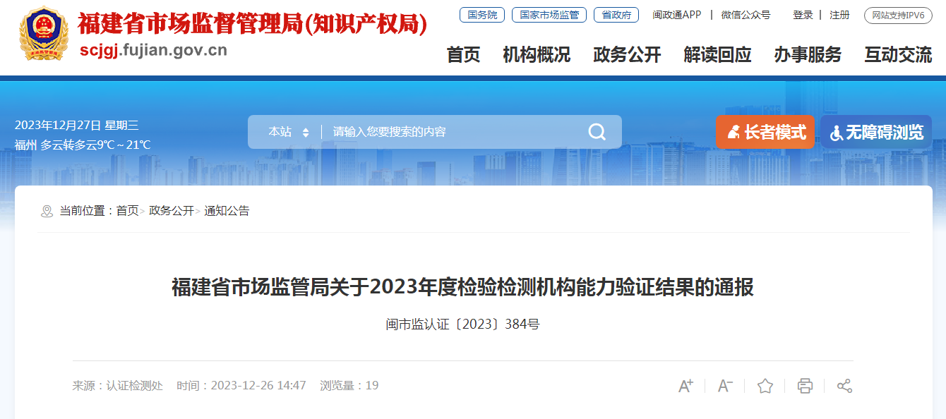 福建省市場監(jiān)管局關(guān)于2023年度檢驗檢測機(jī)構(gòu)能力驗證結(jié)果的通報