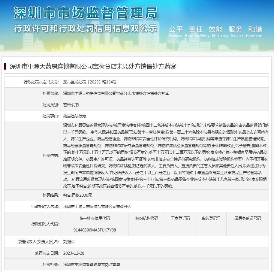 深圳市中源大藥房連鎖有限公司寶荷分店未憑處方銷售處方藥案