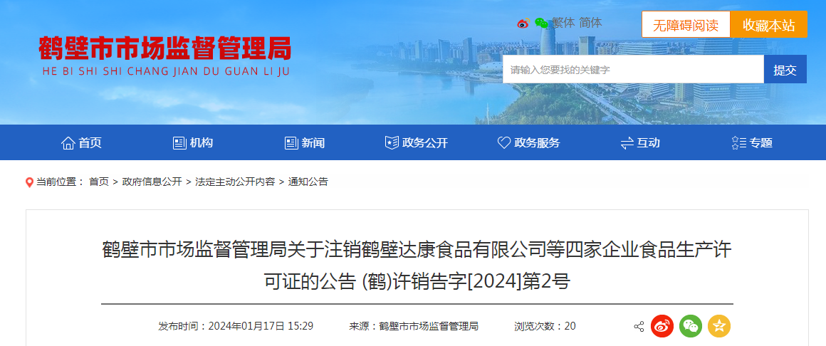 鶴壁市市場監(jiān)督管理局關于注銷鶴壁達康食品有限公司等四家企業(yè)食品生產(chǎn)許可證的公告 (鶴)許銷告字[2024]第2號