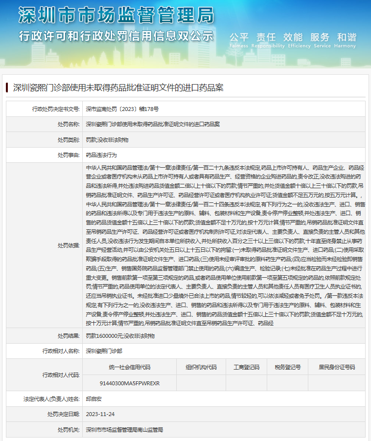 深圳瓷熙門診部使用未取得藥品批準證明文件的進口藥品案
