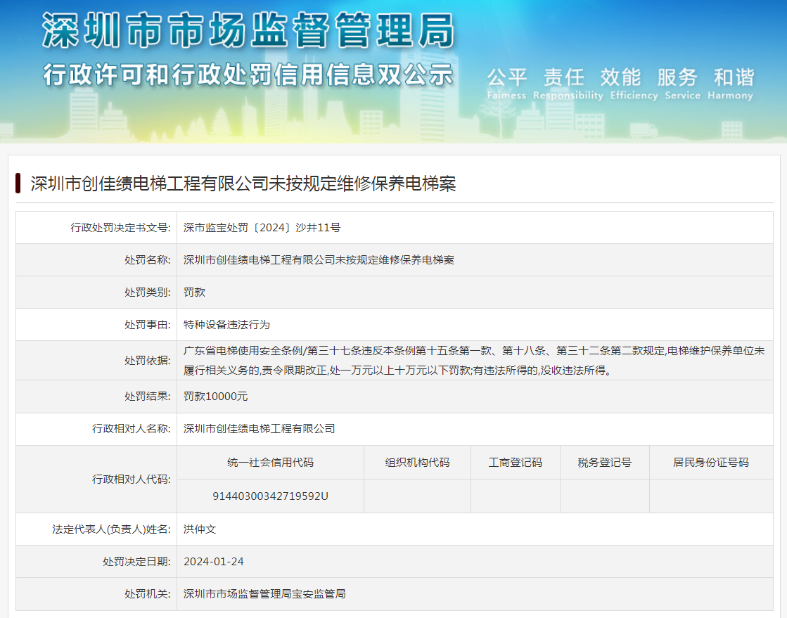 深圳市創(chuàng)佳績電梯工程有限公司未按規(guī)定維修保養(yǎng)電梯案