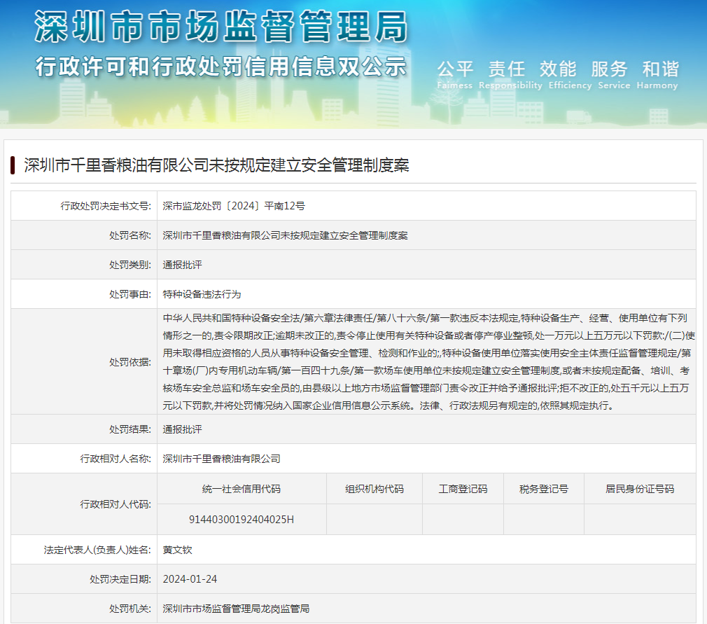 深圳市千里香糧油有限公司未按規(guī)定建立安全管理制度案