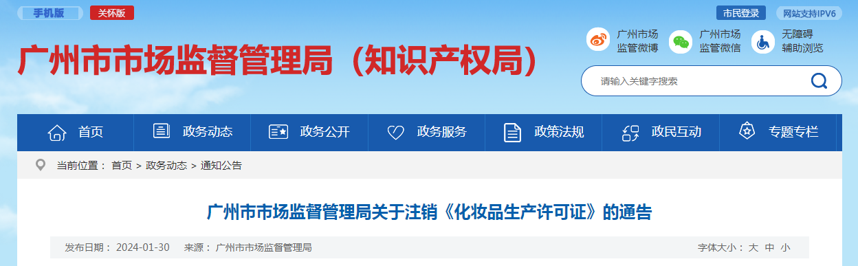 根據(jù)《中華人民共和國行政許可法》《化妝品監(jiān)督管理條例》及《化妝品生產(chǎn)經(jīng)營監(jiān)督管理辦法》等有關(guān)規(guī)定,我局依法注銷廣州市佳蔻化妝品有限公司化妝品生產(chǎn)企業(yè)的化妝品生產(chǎn)許可證,現(xiàn)予以公布。