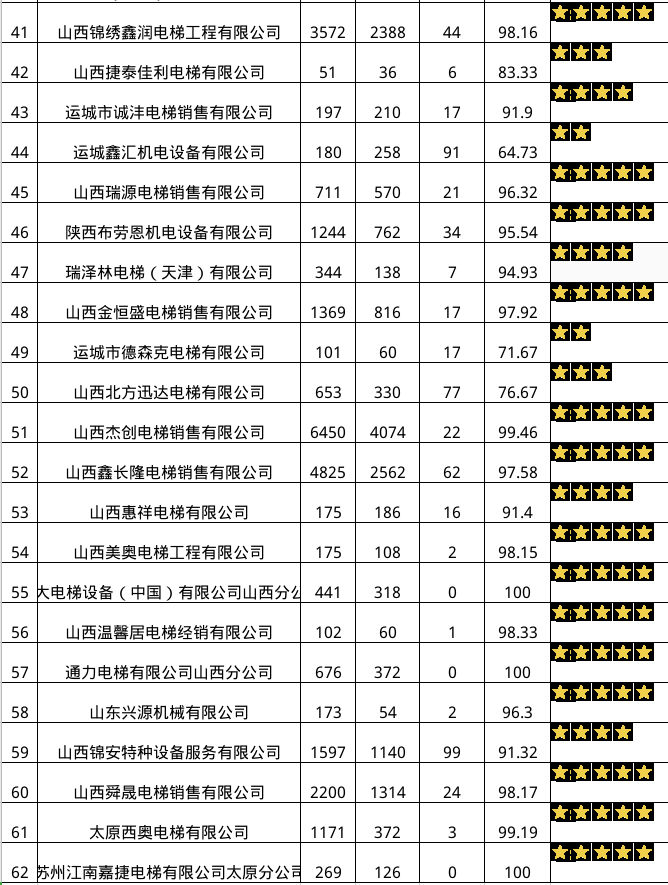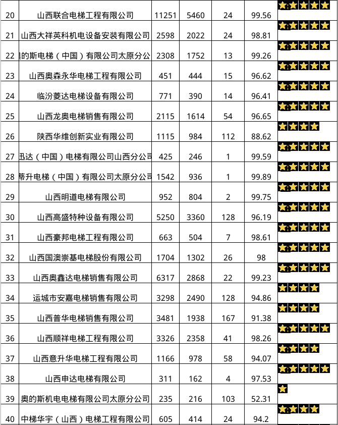 2023年第四季度運(yùn)城市電梯維保公司維保質(zhì)量星級(jí)評(píng)定