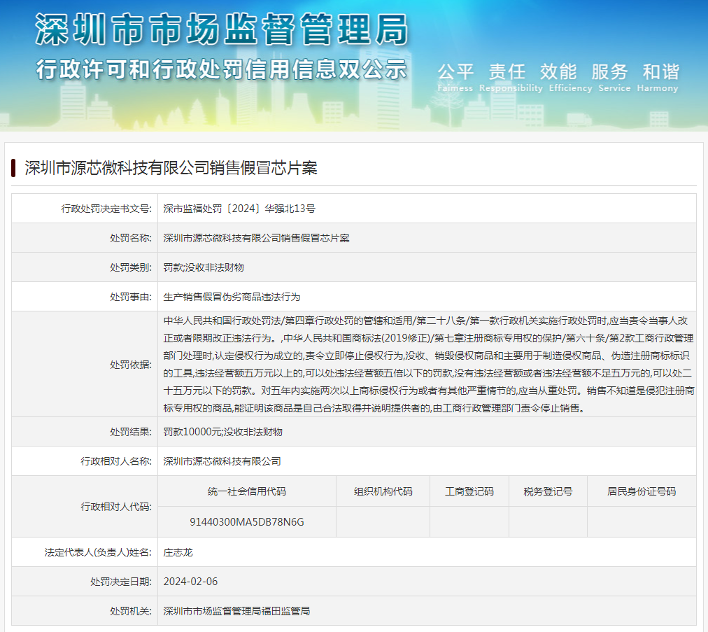 深圳市源芯微科技有限公司銷(xiāo)售假冒芯片案