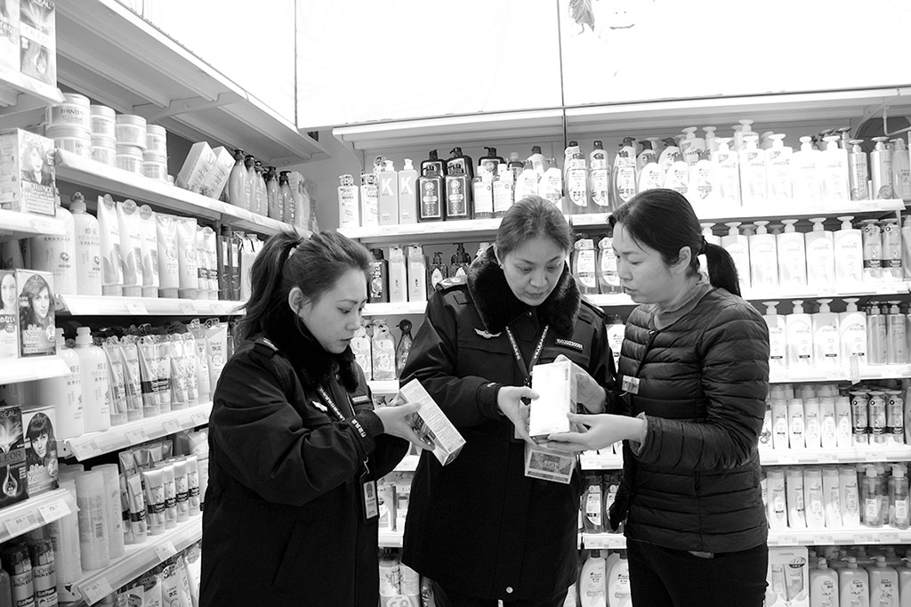 圖為執(zhí)法人員在一家化妝品經營企業(yè)檢查。韓吳琦 攝