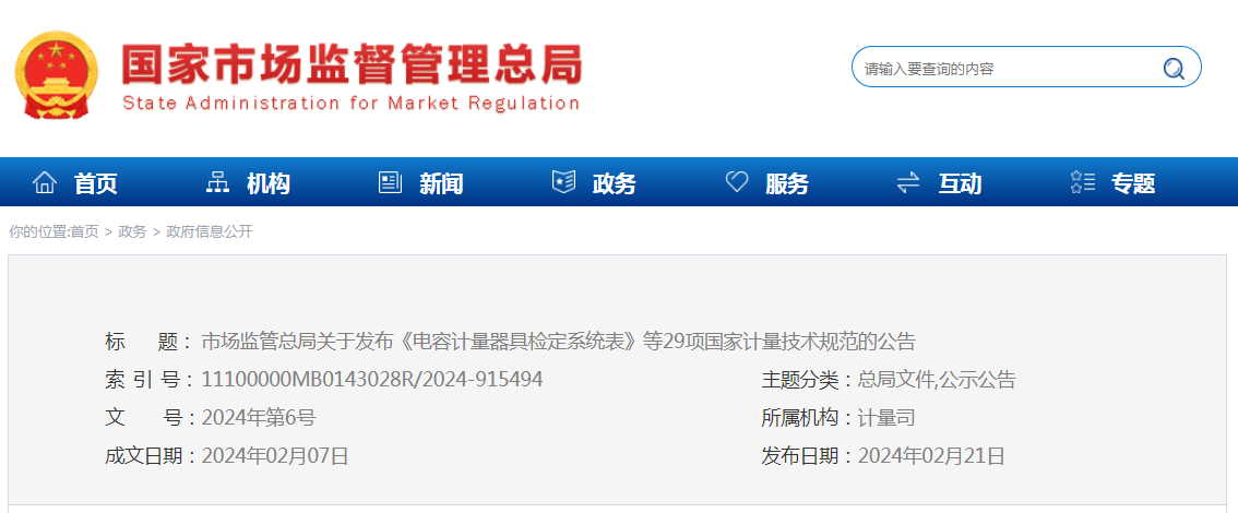 市場監(jiān)管總局關(guān)于發(fā)布《電容計量器具檢定系統(tǒng)表》等29項國家計量技術(shù)規(guī)范的公告