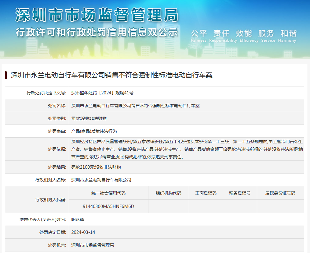 深圳市永蘭電動自行車有限公司銷售不符合強制性標準電動自行車案