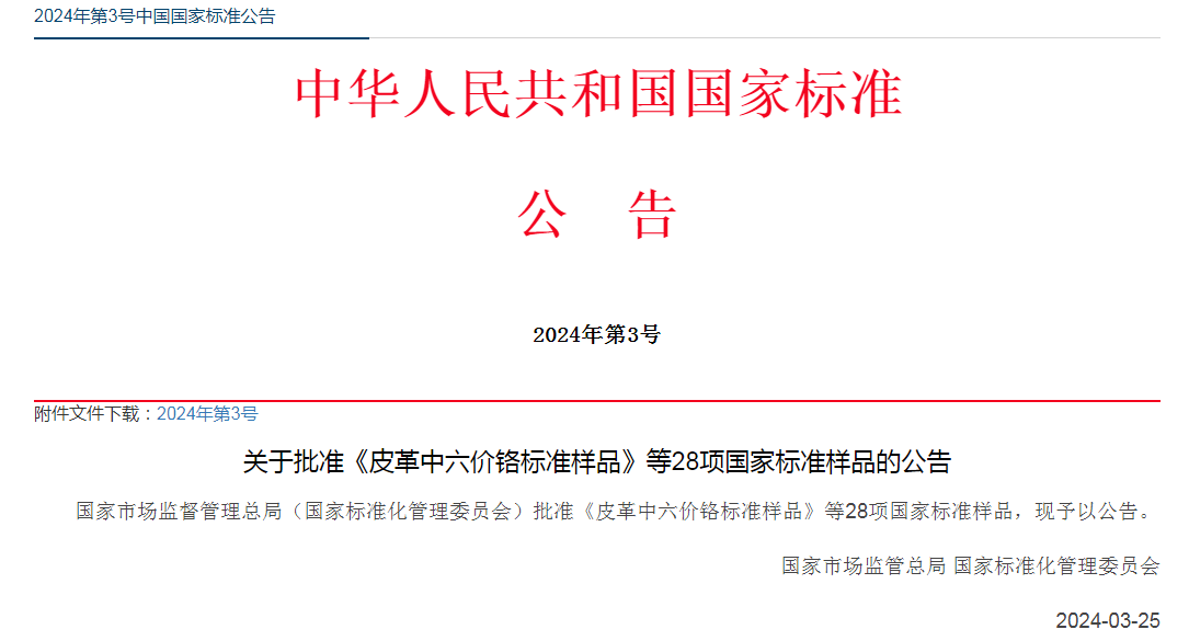 關(guān)于批準《皮革中六價鉻標準樣品》等28項國家標準樣品的公告