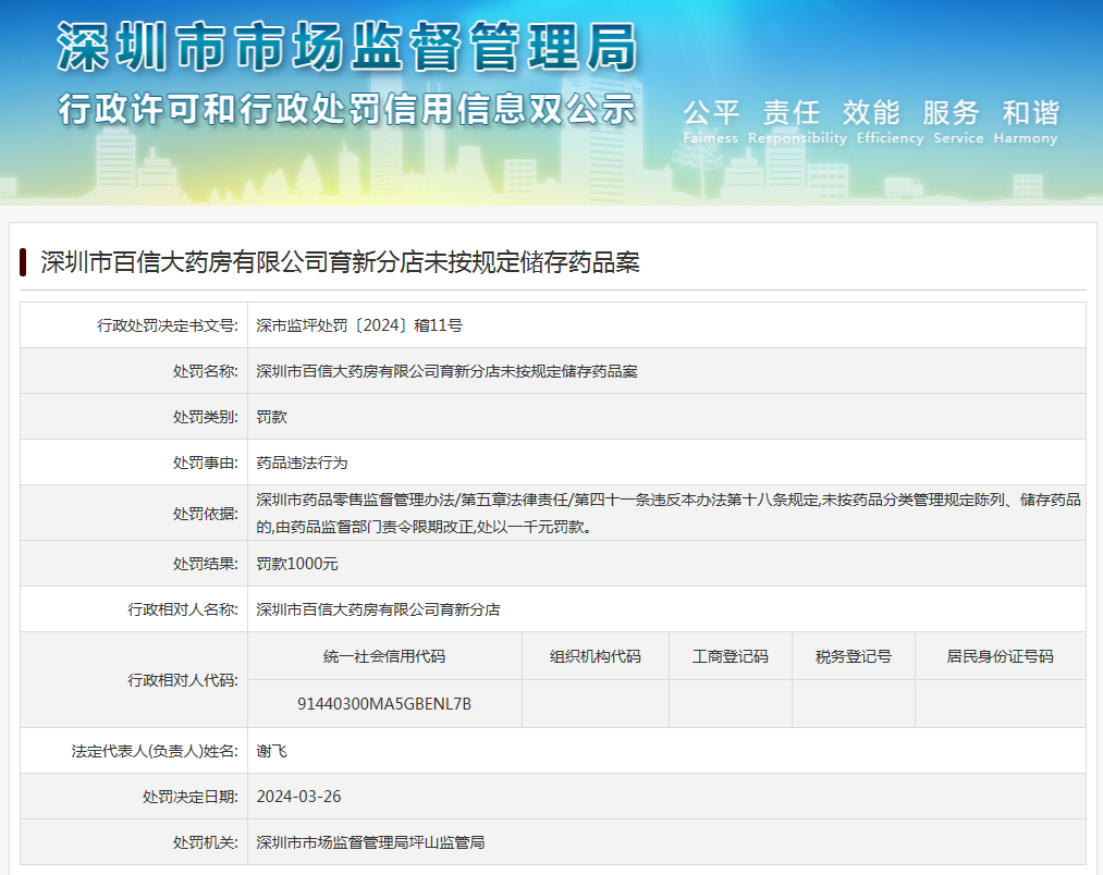 深圳市百信大藥房有限公司育新分店未按規(guī)定儲(chǔ)存藥品案