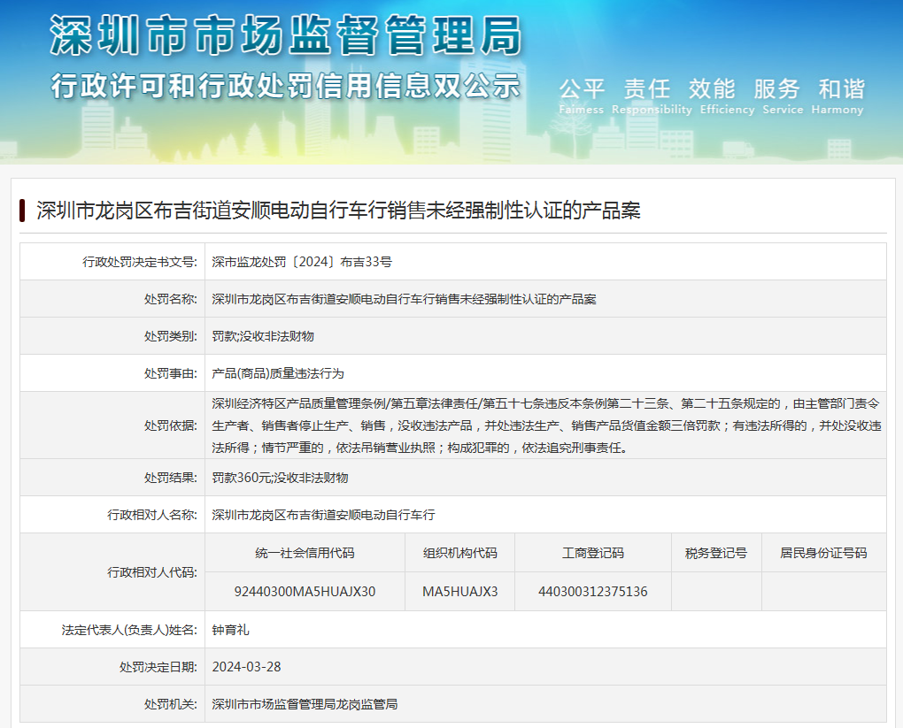 深圳市龍崗區(qū)布吉街道安順電動自行車行銷售未經(jīng)強(qiáng)制性認(rèn)證的產(chǎn)品案