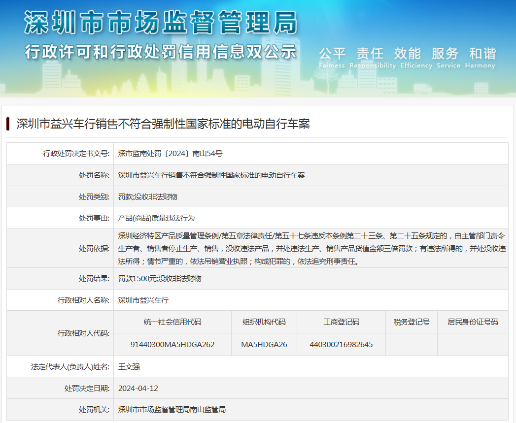 深圳市益興車行銷售不符合強(qiáng)制性國家標(biāo)準(zhǔn)的電動(dòng)自行車案