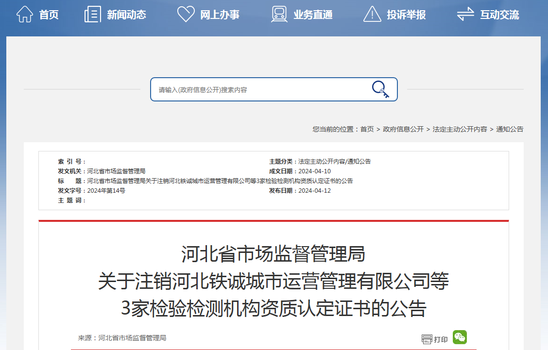 關(guān)于注銷河北鐵誠城市運(yùn)營管理有限公司等3家檢驗(yàn)檢測機(jī)構(gòu)資質(zhì)認(rèn)定證書的公告