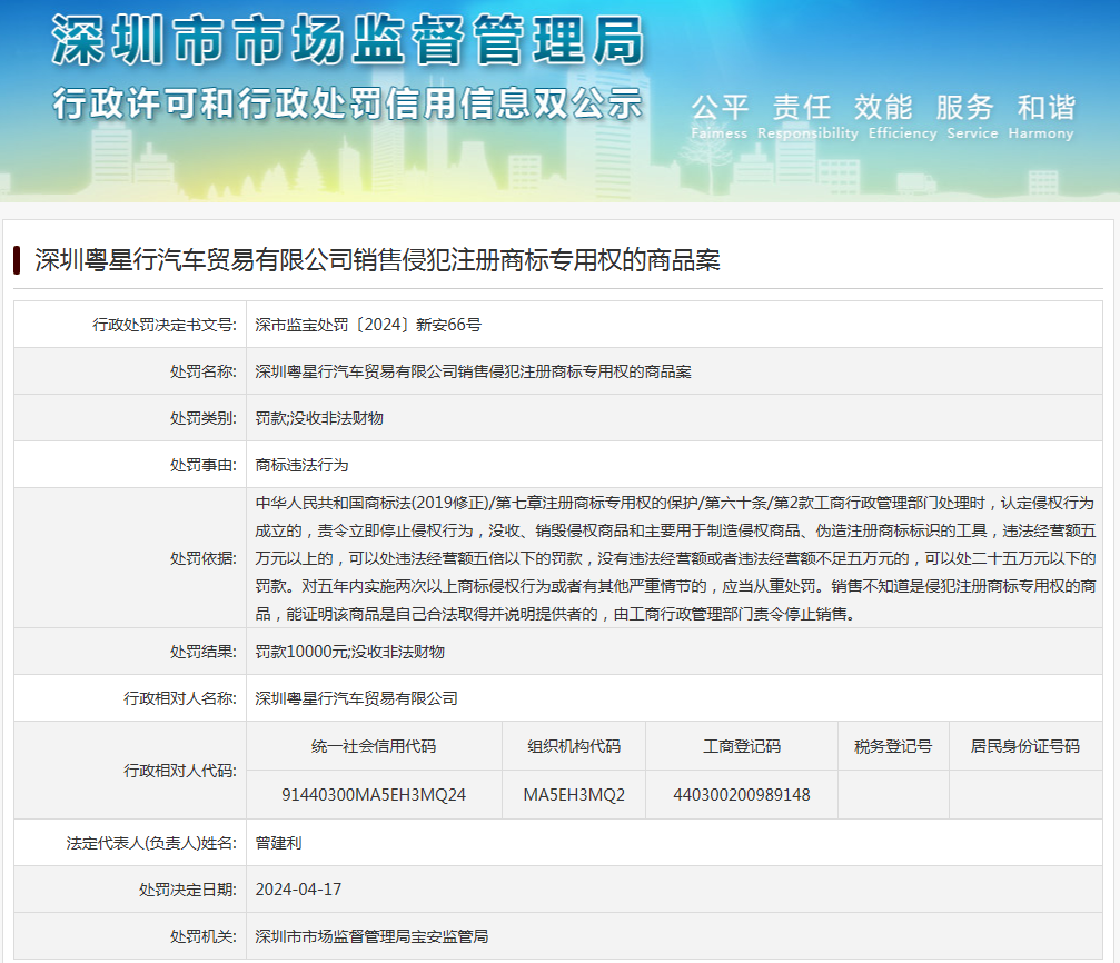 深圳粵星行汽車貿(mào)易有限公司銷售侵犯注冊商標專用權(quán)的商品案