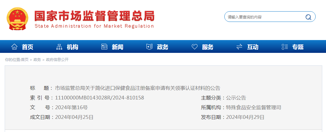 市場(chǎng)監(jiān)管總局關(guān)于簡(jiǎn)化進(jìn)口保健食品注冊(cè)備案申請(qǐng)有關(guān)領(lǐng)事認(rèn)證材料的公告