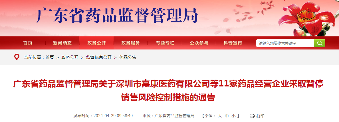 廣東省藥品監(jiān)督管理局關于深圳市嘉康醫(yī)藥有限公司等11家藥品經(jīng)營企業(yè)采取暫停銷售風險控制措施的通告