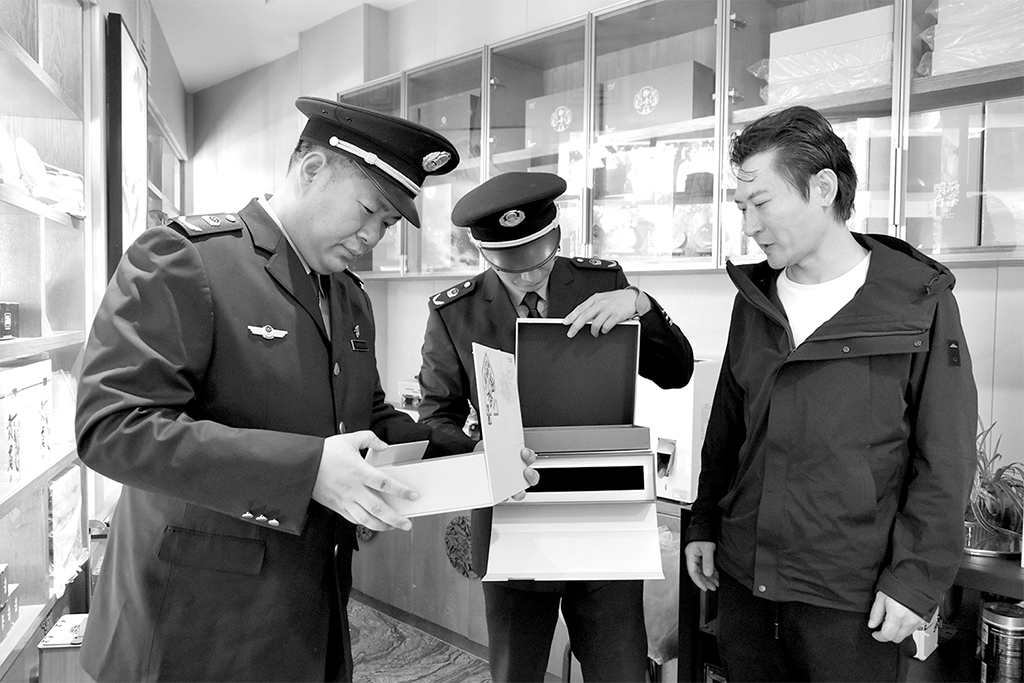 近日,浙江省湖州市吳興區(qū)市場監(jiān)管局以茶葉專賣店、大型超市為重點(diǎn),采用“一看、二問、三算”的方式,重點(diǎn)檢查茶葉產(chǎn)品在流通領(lǐng)域銷售環(huán)節(jié)是否存在過度包裝問題。一看商品的外包裝是否屬于豪華包裝,二問商品包裝是否超過要求層數(shù),三算包裝空隙率是否符合國標(biāo)要求。圖為執(zhí)法人員在一家茶葉專賣店進(jìn)行現(xiàn)場檢查。孫建新 章 咪 文/攝