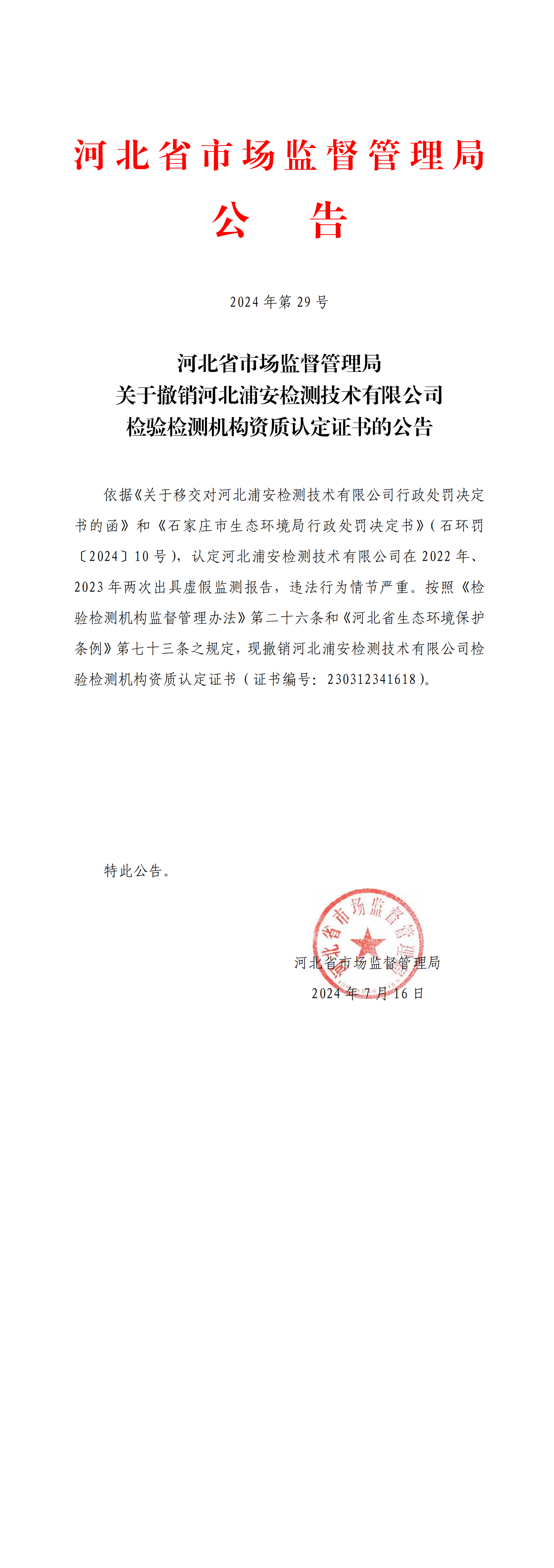 河北省市場監(jiān)督管理局關(guān)于撤銷河北浦安檢測技術(shù)有限公司檢驗檢測機(jī)構(gòu)資質(zhì)認(rèn)定證書的公告