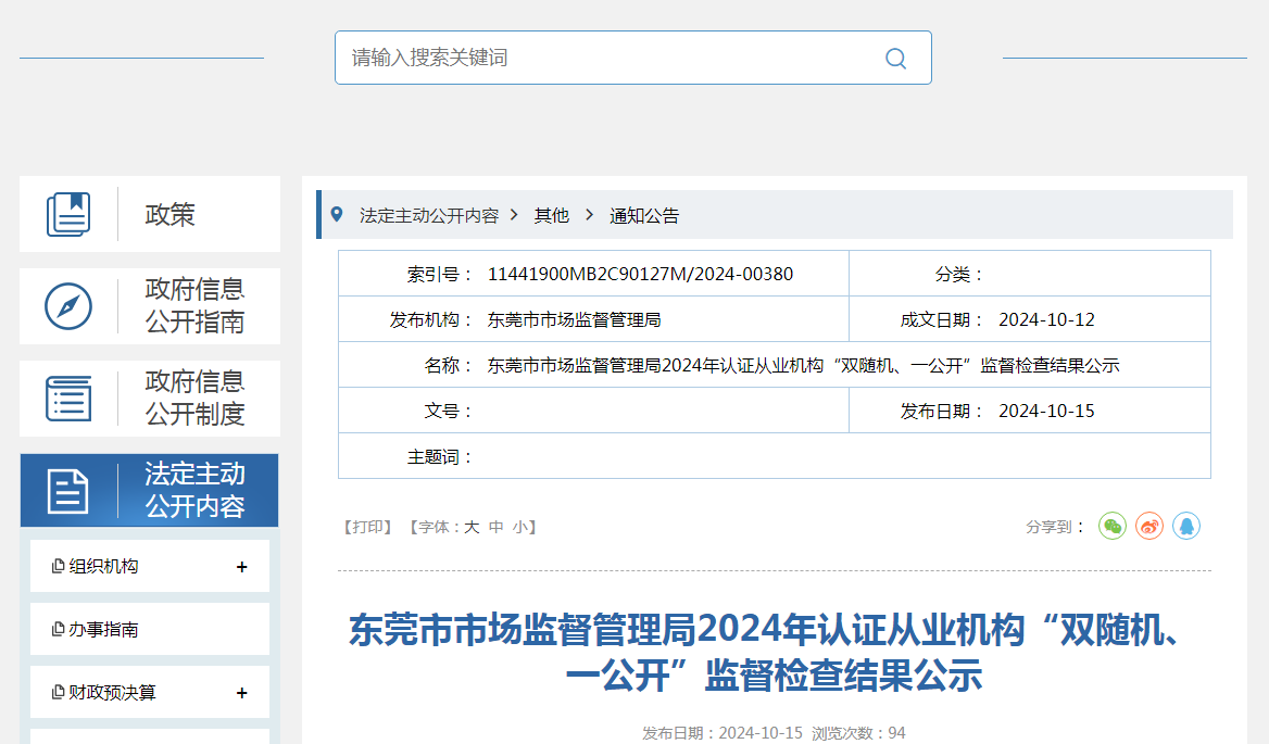 東莞市市場(chǎng)監(jiān)督管理局2024年認(rèn)證從業(yè)機(jī)構(gòu)“雙隨機(jī)、一公開”監(jiān)督檢查結(jié)果公示