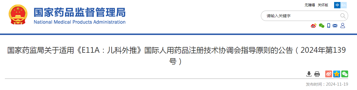 國家藥監(jiān)局關(guān)于適用《E11A:兒科外推》國際人用藥品注冊(cè)技術(shù)協(xié)調(diào)會(huì)指導(dǎo)原則的公告(2024年第139號(hào))