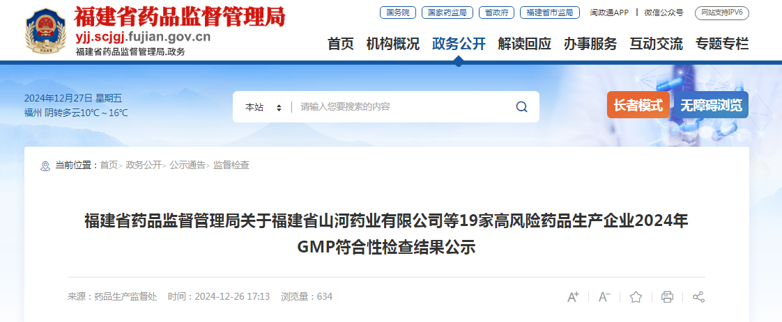 福建省藥品監(jiān)督管理局關于福建省山河藥業(yè)有限公司等19家高風險藥品生產(chǎn)企業(yè)2024年GMP符合性檢查結(jié)果公示