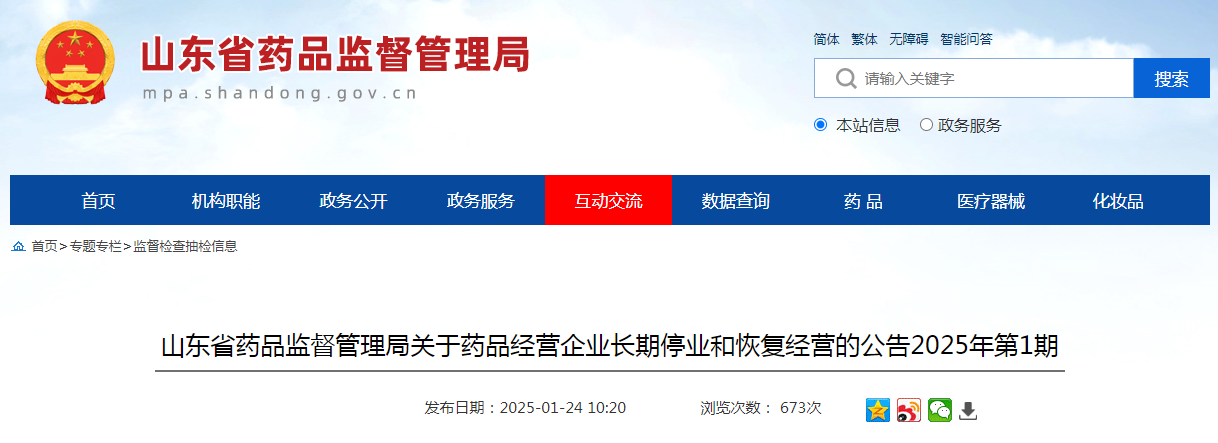 山東省藥品監(jiān)督管理局關(guān)于藥品經(jīng)營(yíng)企業(yè)長(zhǎng)期停業(yè)和恢復(fù)經(jīng)營(yíng)的公告2025年第1期