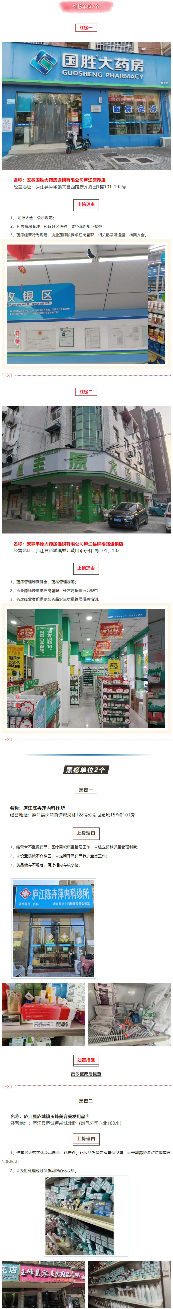 為進(jìn)一步加強(qiáng)藥品安全監(jiān)管,推進(jìn)藥品(含醫(yī)療器械、化妝品)流通領(lǐng)域規(guī)范管理水平和信用體系建設(shè),強(qiáng)化守信激勵(lì)和失信懲戒力度,全面提升藥品安全整體水平,保障人民群眾用藥安全,安徽省廬江縣市場(chǎng)監(jiān)督管理局推行藥品安全“紅黑榜”管理制度。現(xiàn)公示第四期“紅黑榜”名單。
