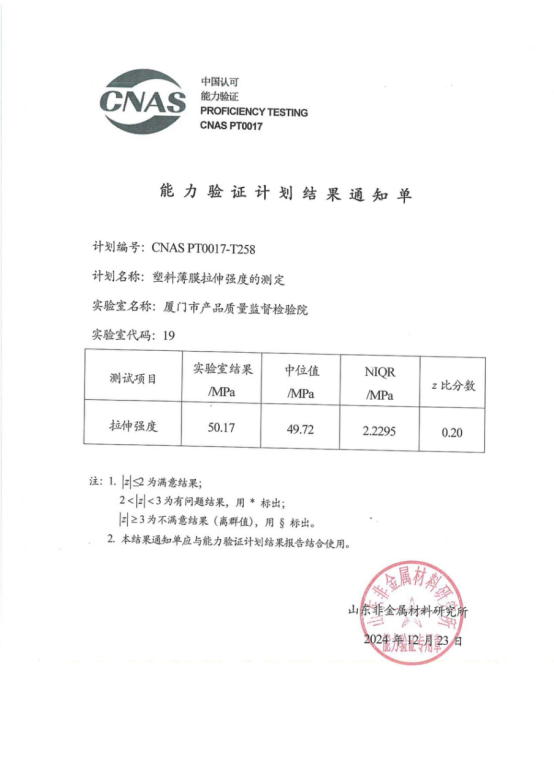 中國質(zhì)量新聞網(wǎng)訊 近日,廈門市質(zhì)檢院收到“塑料薄膜拉伸強度的測定”能力驗證結(jié)果證書,成績優(yōu)異。其z比分數(shù)僅為0.20,遠低于標準規(guī)定的(| z |≤2),結(jié)果評定為滿意。這一結(jié)果,彰顯了市質(zhì)檢院在該檢測領域的專業(yè)實力與技術(shù)優(yōu)勢。