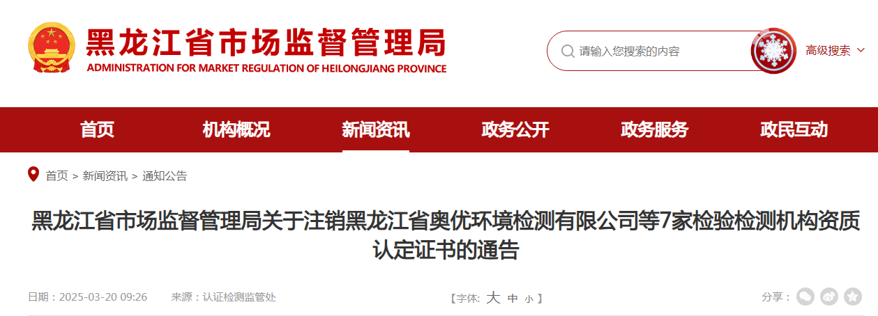 中國(guó)質(zhì)量新聞網(wǎng)訊 近日,黑龍江省市場(chǎng)監(jiān)督管理局發(fā)布關(guān)于注銷黑龍江省奧優(yōu)環(huán)境檢測(cè)有限公司等7家檢驗(yàn)檢測(cè)機(jī)構(gòu)資質(zhì)認(rèn)定證書(shū)的通告。