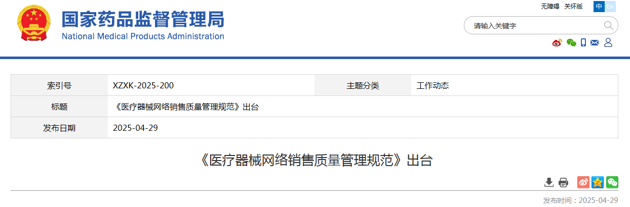 4月28日,國(guó)家藥監(jiān)局發(fā)布《醫(yī)療器械網(wǎng)絡(luò)銷售質(zhì)量管理規(guī)范》(以下簡(jiǎn)稱《規(guī)范》),自2025年10月1日起施行。