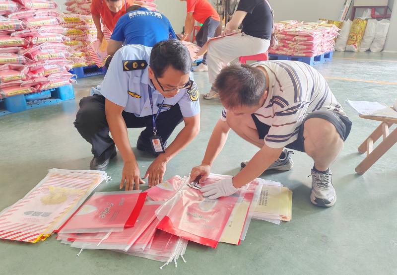 執(zhí)法人員與檢驗(yàn)人員仔細(xì)核對大米商品包裝上標(biāo)注凈含量的字符高度(圖:梁曉珊)