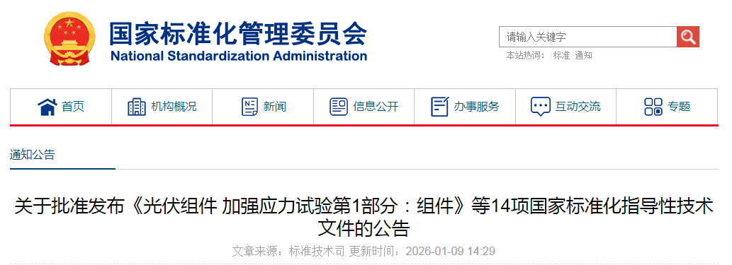 關(guān)于批準(zhǔn)發(fā)布《光伏組件 加強(qiáng)應(yīng)力試驗(yàn)第1部分:組件》等14項(xiàng)國(guó)家標(biāo)準(zhǔn)化指導(dǎo)性技術(shù)文件的公告