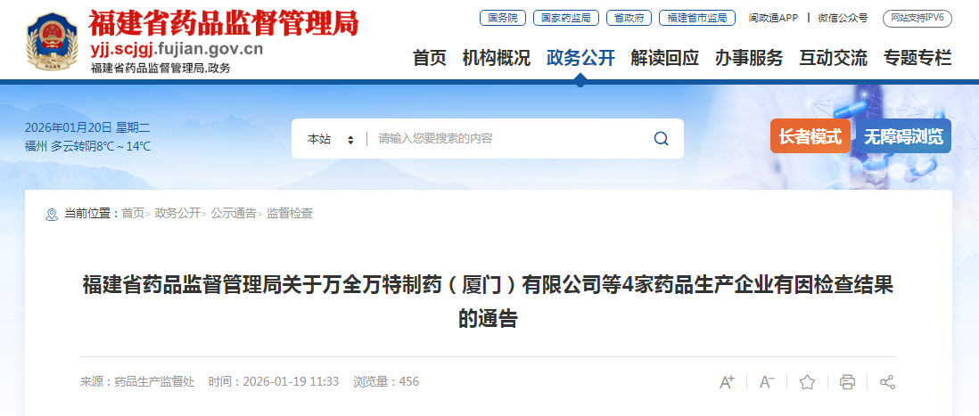 福建省藥品監(jiān)督管理局關(guān)于萬全萬特制藥(廈門)有限公司等4家藥品生產(chǎn)企業(yè)有因檢查結(jié)果的通告