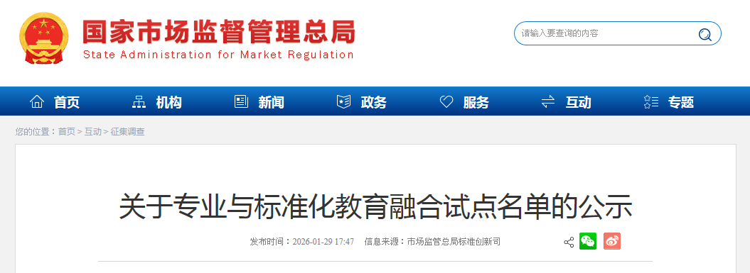 為加強(qiáng)兼具專業(yè)能力和標(biāo)準(zhǔn)化知識技能的高素質(zhì)人才教育,根據(jù)《市場監(jiān)管總局 教育部關(guān)于做好專業(yè)與標(biāo)準(zhǔn)化教育融合試點(diǎn)申報工作的通知》(國市監(jiān)標(biāo)創(chuàng)發(fā)〔2025〕80號)工作部署,經(jīng)組織申報、審核推薦和專家評審,形成了專業(yè)與標(biāo)準(zhǔn)化教育融合試點(diǎn)公示名單,現(xiàn)予以公示。如有異議,請在公示期內(nèi)將書面意見反饋至市場監(jiān)管總局標(biāo)準(zhǔn)創(chuàng)新司、教育部政策法規(guī)司。