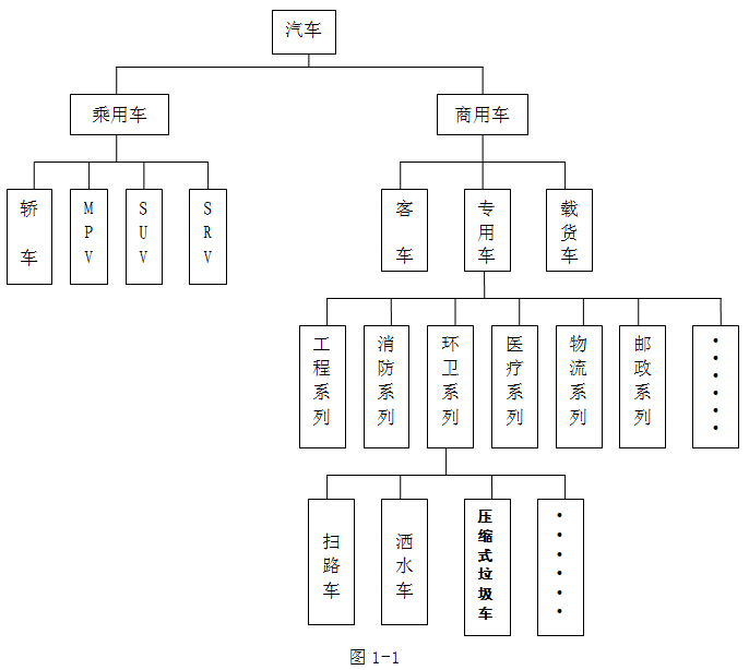 壓縮式垃圾車屬環(huán)衛(wèi)系列專用車的一種,其在汽車產(chǎn)業(yè)中的位置見圖1-1。
