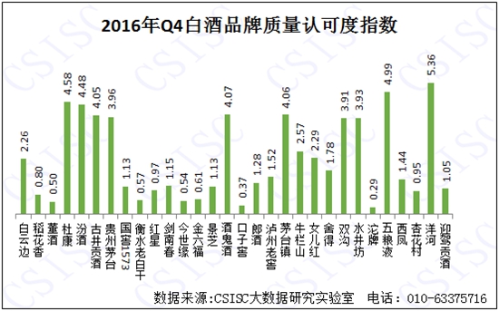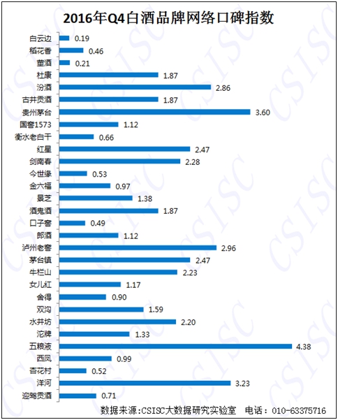 基于中國統(tǒng)計信息服務中心研發(fā)的大數(shù)據(jù)監(jiān)測系統(tǒng),經(jīng)數(shù)據(jù)處理分析,2016年第四季度白酒行業(yè)網(wǎng)絡口碑指數(shù)榜單中,五糧液、貴州茅臺和洋河等品牌表現(xiàn)優(yōu)異,引領口碑榜單;瀘州老窖品牌口碑也比較穩(wěn)定,汾酒、茅臺鎮(zhèn)、紅星、劍南春等也長期處于口碑榜單前列。排名較高的品牌口碑較為穩(wěn)定,之后的品牌次序存在波動。口碑競爭猶如逆水行舟,各品牌需不斷加強自身的口碑建設。