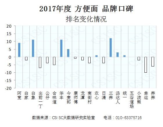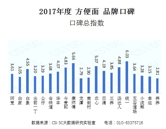 基于國(guó)統(tǒng)?首頁HOME BA大數(shù)據(jù)采集系統(tǒng)平臺(tái)數(shù)據(jù),經(jīng)處理分析,2017年方便面網(wǎng)絡(luò)口碑總指數(shù)榜單中,與上期相比,新入榜品牌有阿寬、三養(yǎng);落榜品牌有華龍。其中,統(tǒng)一、康師傅、農(nóng)心,此3個(gè)品牌在口碑總指數(shù)中位居前三。統(tǒng)一、康師傅、農(nóng)心、湯達(dá)人、今麥郎、日清、合味道在近兩期中表現(xiàn)穩(wěn)定,口碑總指數(shù)位居前十。白象、華豐、三養(yǎng)在本期口碑總指數(shù)中有強(qiáng)勁表現(xiàn),晉升至前十,幸運(yùn)、出前一丁、公仔則在本期口碑總指數(shù)中掉出前十。