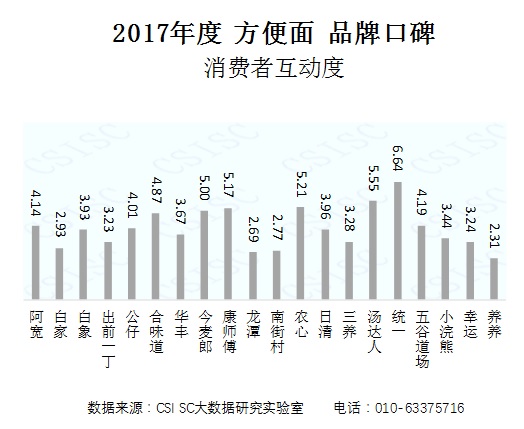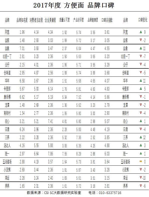 中國(guó)統(tǒng)計(jì)信息服務(wù)中心大數(shù)據(jù)研究實(shí)驗(yàn)室基于國(guó)統(tǒng)?首頁HOME BA平臺(tái)數(shù)據(jù)及大數(shù)據(jù)技術(shù)分析,以第三方視角,從該品類市場(chǎng)125個(gè)方便面品牌中篩選出19個(gè)表現(xiàn)比較突出的品牌作為研究對(duì)象,包括:白家、白象、出前一丁、公仔、合味道、華豐、華龍、今麥郎、康師傅、龍?zhí)?、南街村、農(nóng)心、日清、湯達(dá)人、統(tǒng)一、五谷道場(chǎng)、小浣熊、幸運(yùn)、養(yǎng)養(yǎng)(以字母順序排名),綜合運(yùn)用網(wǎng)媒、電商、論壇等網(wǎng)絡(luò)數(shù)據(jù),通過品牌知名度、企業(yè)美譽(yù)度、品牌健康度、質(zhì)量認(rèn)可度、產(chǎn)品好評(píng)度、消費(fèi)者互動(dòng)度等六個(gè)維度對(duì)這19個(gè)方便面品牌進(jìn)行了品牌口碑指數(shù)評(píng)價(jià),形成了《2017年方便面品牌口碑研究報(bào)告》(以下簡(jiǎn)稱“報(bào)告”)。