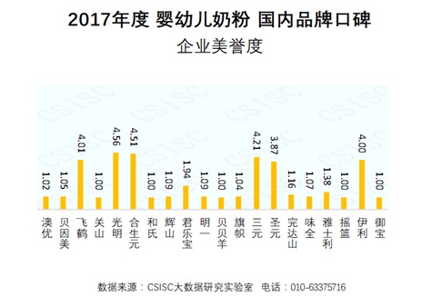 2017年度嬰幼兒奶粉國內(nèi)品牌口碑總指數(shù)榜單中,數(shù)據(jù)顯示,與上期相比,新入榜品牌有澳優(yōu)、關(guān)山、光明、和氏、旗幟、味全、搖籃;落榜品牌有寶樂滋、紅星、能羊、太子樂、喜安智、陽光寶寶、英氏。三元、飛鶴、合生元品牌在口碑總指數(shù)中位居前三。三元、飛鶴、合生元、伊利、圣元、君樂寶、貝因美、雅士利在近兩期中表現(xiàn)穩(wěn)定,口碑總指數(shù)位居前十。光明、完達(dá)山在本期口碑總指數(shù)中有強(qiáng)勁表現(xiàn),晉升至前十,貝貝羊、陽光寶寶則在本期口碑總指數(shù)中掉出前十。