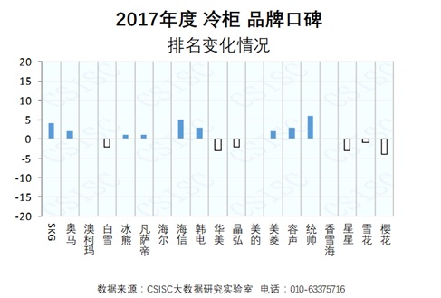 2017年度冷柜品牌口碑總指數(shù)榜單中,數(shù)據(jù)顯示,澳柯瑪、海爾、美的品牌在口碑總指數(shù)中位居前三。澳柯瑪、海爾、美的、美菱、海信、容聲、星星、櫻花、華美在近兩期中表現(xiàn)穩(wěn)定,口碑總指數(shù)位居前十。統(tǒng)帥在本期口碑總指數(shù)中有強(qiáng)勁表現(xiàn),晉升至前十,新飛則在本期口碑總指數(shù)中掉出前十。