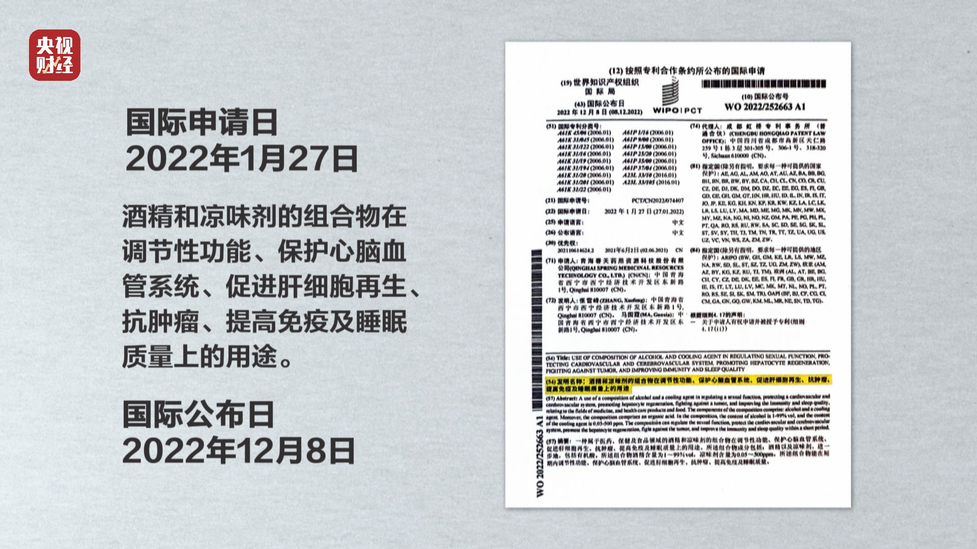 聽花酒申請的專利到底是什么?根據(jù)聽花酒公開資料顯示,2022年1月27日,聽花酒申請的國際專利,名稱為《酒精和涼味劑的組合物在調(diào)節(jié)性功能、保護(hù)心腦血管系統(tǒng)、促進(jìn)肝細(xì)胞再生、抗腫瘤、提高免疫及睡眠質(zhì)量上的用途》,公布日為2022年12月8日。
